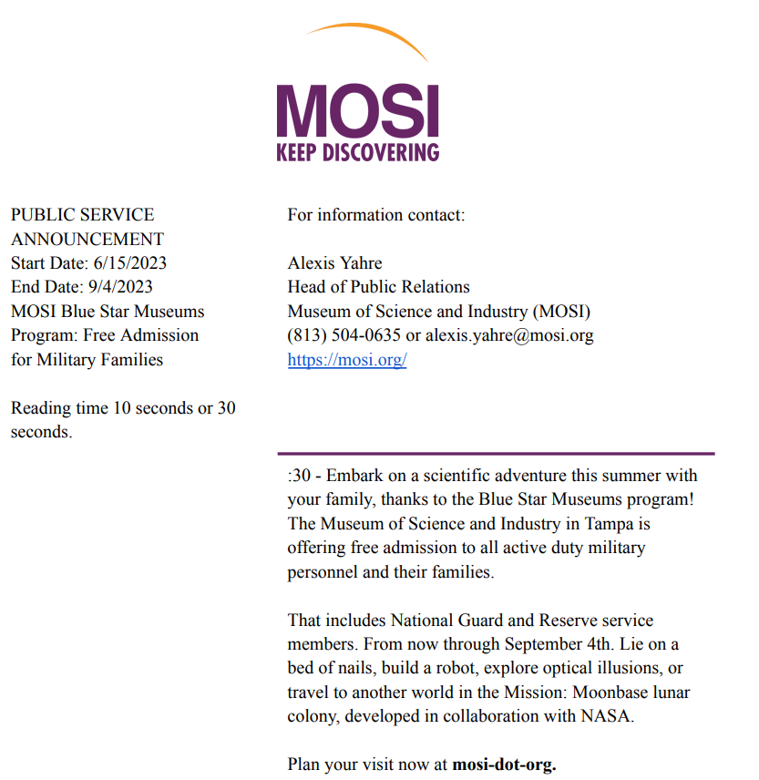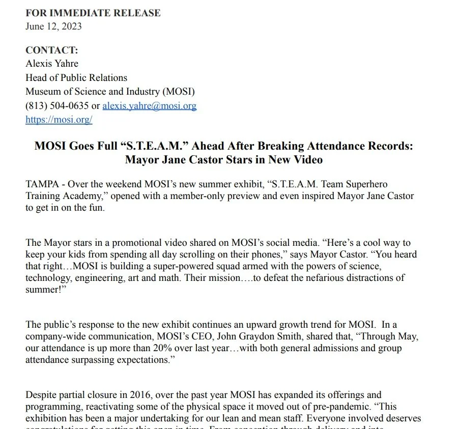 Press Release: A press release is more than just an informational snippet; it's a chance to shape the reception of news. In this case, I announced a new museum exhibit by drawing supporting facts from internal attendance data. This exhibit ended up receiving coverage across most Tampa outlets and drew a great turnout of attendees.